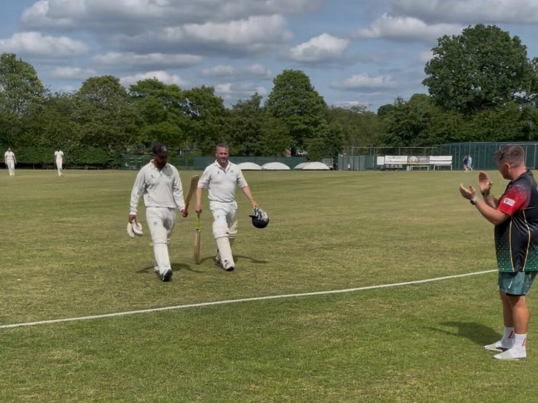 Captain Ishan Tilakaratna raises his bat to the crowd, after making 66* in his side's 85 run victory at Stevenage.